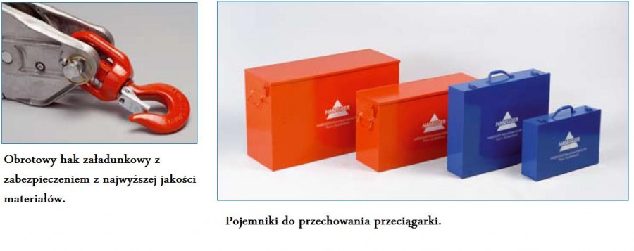 Wszystkie przeciągarki ręczne HIT są oparte na tych samych zasadach działania. Wyprostowana lina bez względu na swoją długość jest umieszczona w szczękach zaciskowych. Kiedy wprawimy w ruch (tam i z powrotem) drążek napędowy przeciągarki lina jest przesuwana precyzyjnie bez naprężeń i przeskoków w przód lub w tył. Mechanizm dźwigni działa następująco; jedna para zacisku szczęk otwiera się i ciągnie line gdy następna szczęka zaciska się na obwodzie liny. To otwarcie i zamknięcie odbywa sie cyklicznie i naprzemiennie do uzyskania odpowiedniego przesuniecia liny. Oba zaciski i klamry zamykają sie po jednym cyklu pracy. To doskonałe i najlepsze zabezpieczenie przeciaganej liny jakie do tej pory wymyślono.